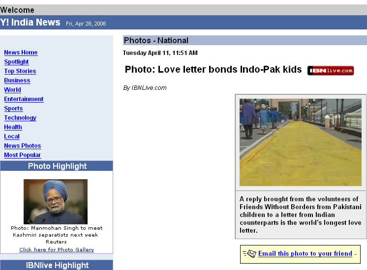 ![]() Love letter bonds Indo-Pak kids Yahoo News - 11 April 2006